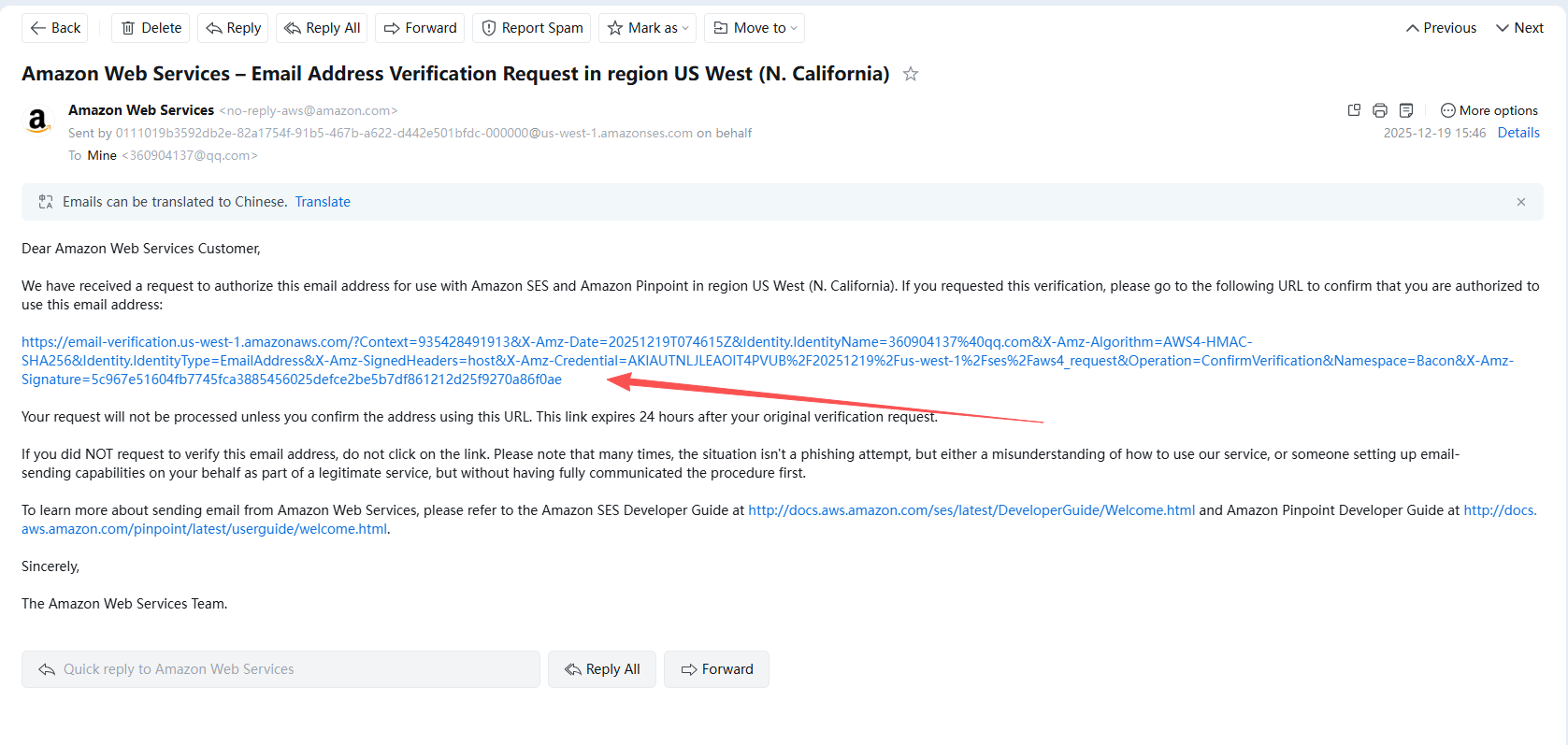 You will be redirected to the AWS SES website. At this point, you have completed the verification.